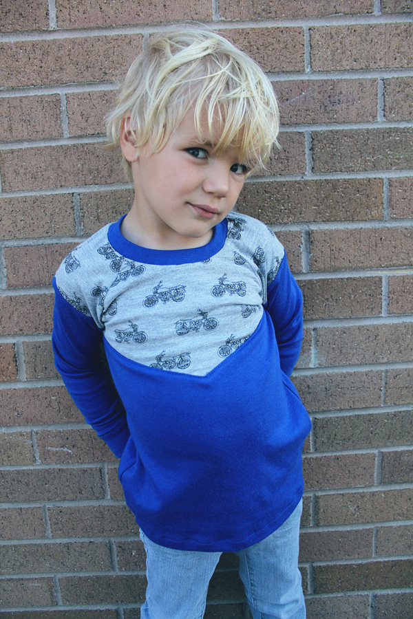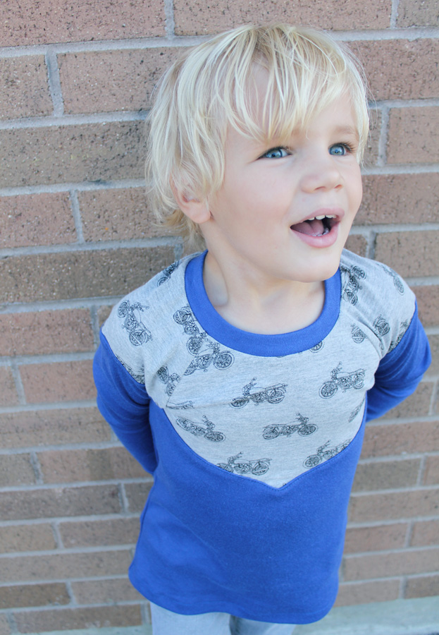 Don’tcha love that smolder! For Charlie’s I used another Girl Charlee fabric I’ve had stashed for him. I love the grey motorcycles and I let him choose what color he wanted with them. Of course he chose blue- everything is blue these days because that is his very favorite color. I was happy because I love him in blue- it brings out those baby blue eyes!