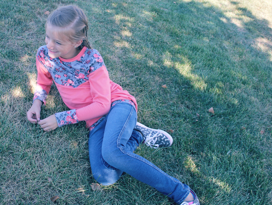 I love this floral fabric from Girl Charlee and I’m excited I have enough left for me too. It paired perfectly with Raspberry Creek’s coral solid. I added wide bands at the wrist and waist to throw in some more of the floral.