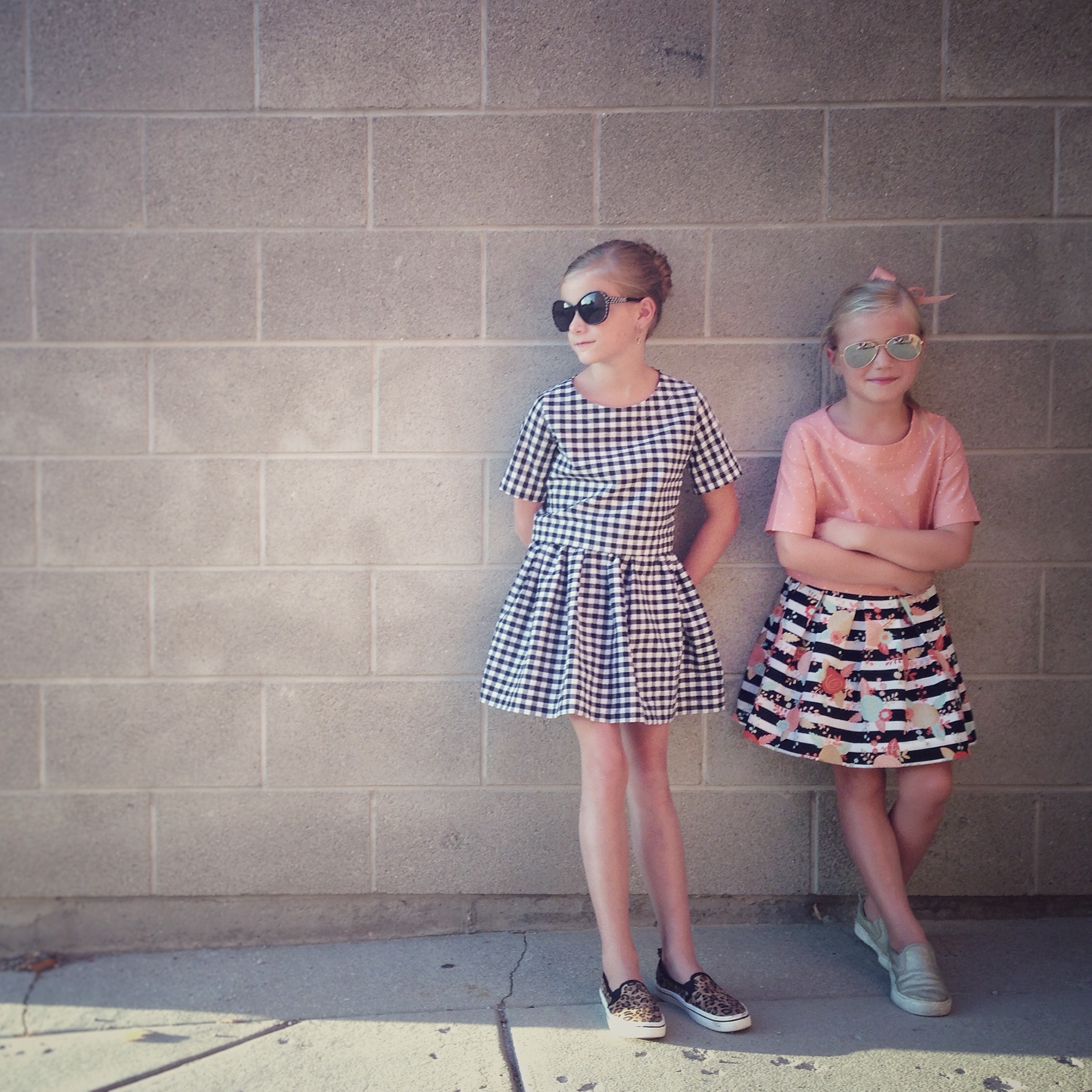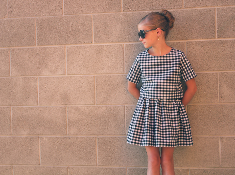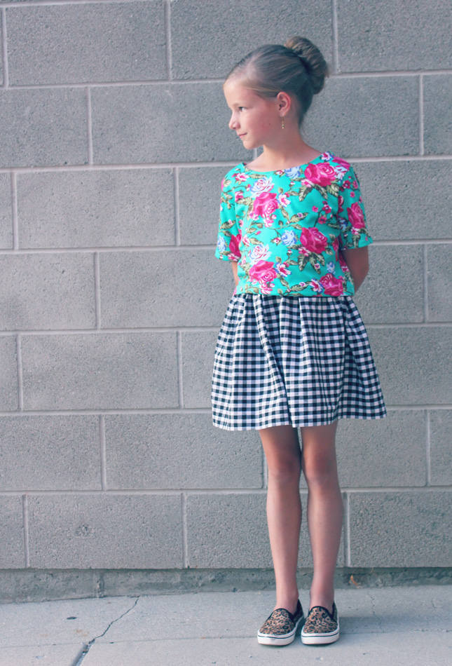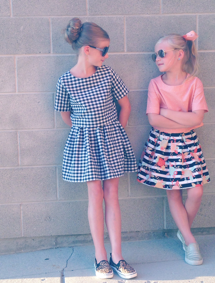 I loved the retro feel of this pattern. I used some black and white gingham (another LA score) and Payton’s fabric combo is from Hobby Lobby (they totally stepped up their fabric game with this new collection!). I did the flat front skirt option and added pleats to Payton’s to change it up a bit.