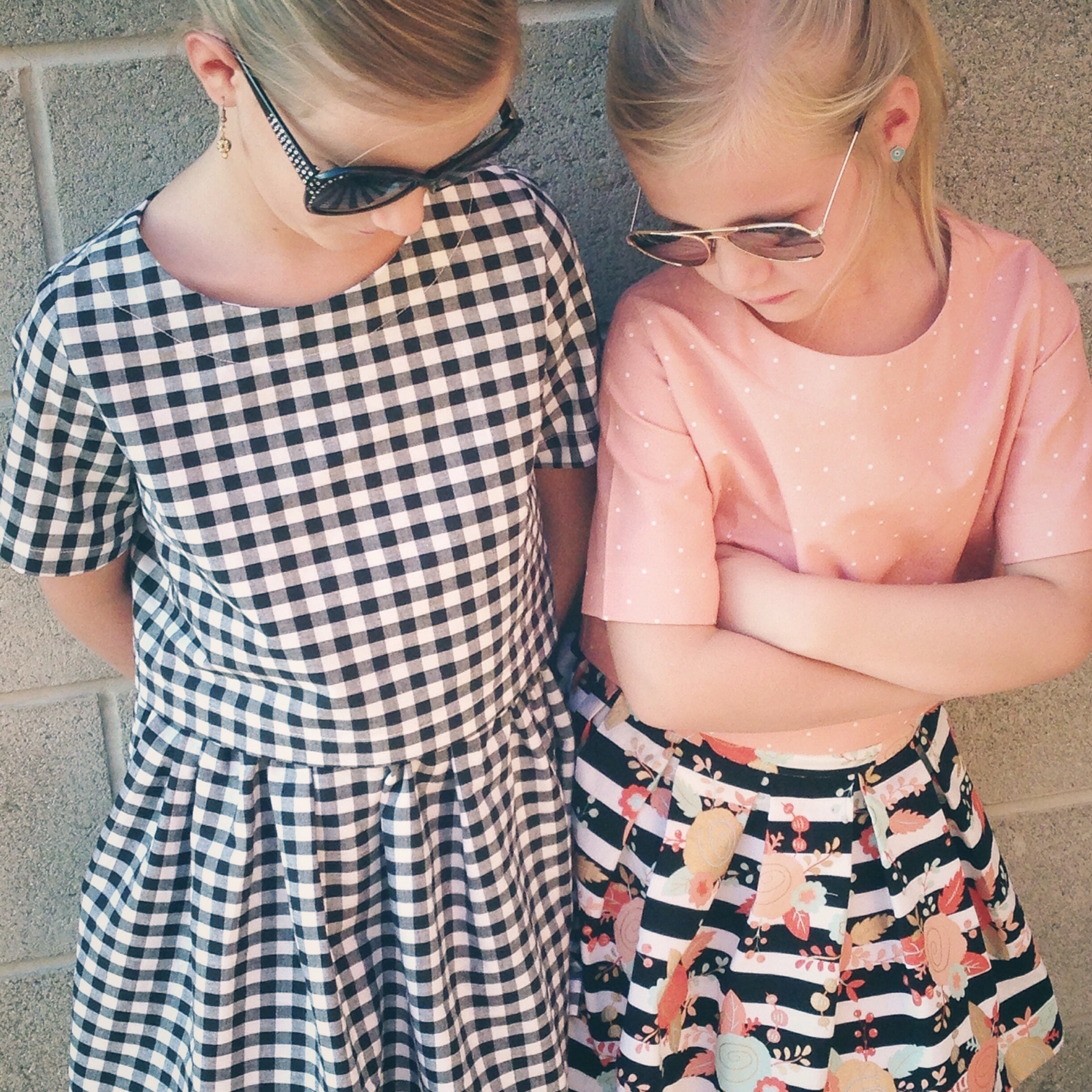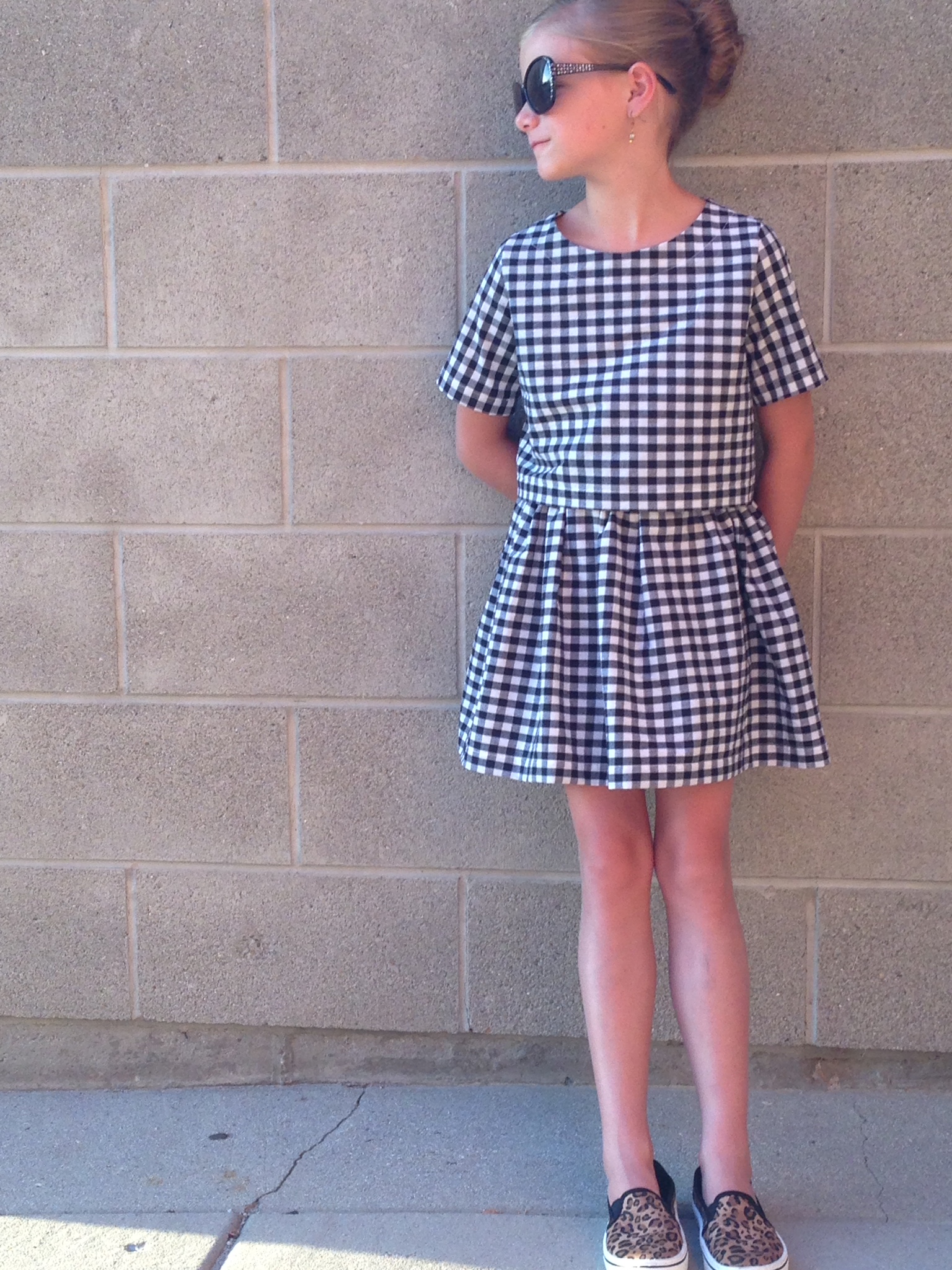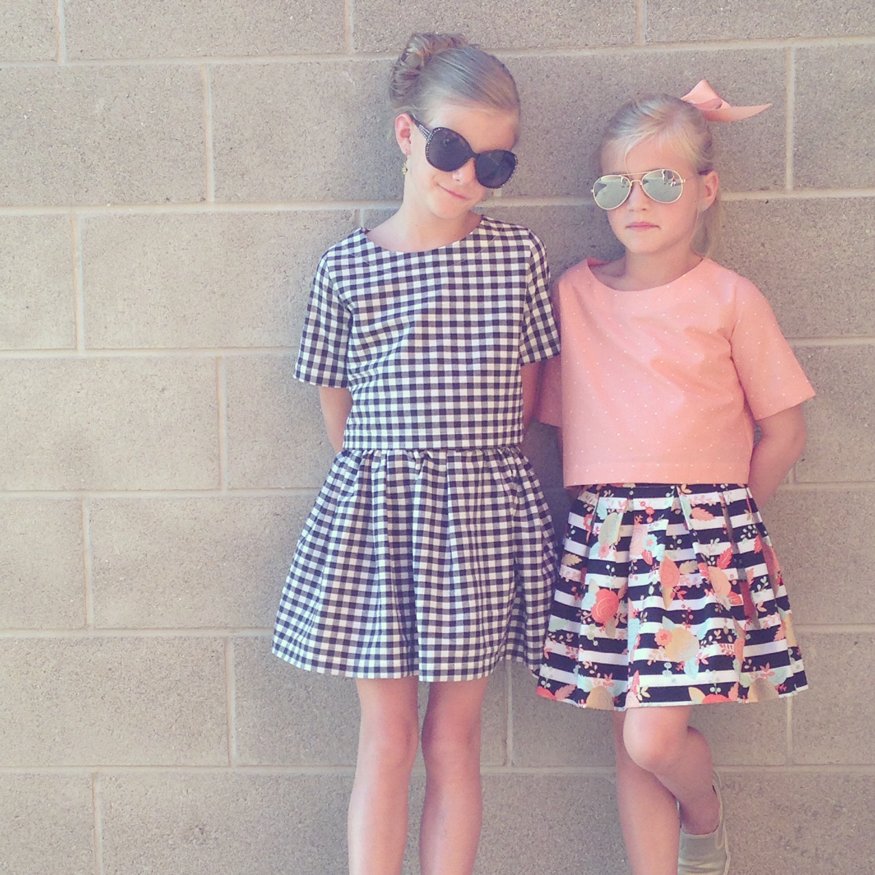 I loved the retro feel of this pattern. I used some black and white gingham (another LA score) and Payton’s fabric combo is from Hobby Lobby (they totally stepped up their fabric game with this new collection!). I did the flat front skirt option and added pleats to Payton’s to change it up a bit.