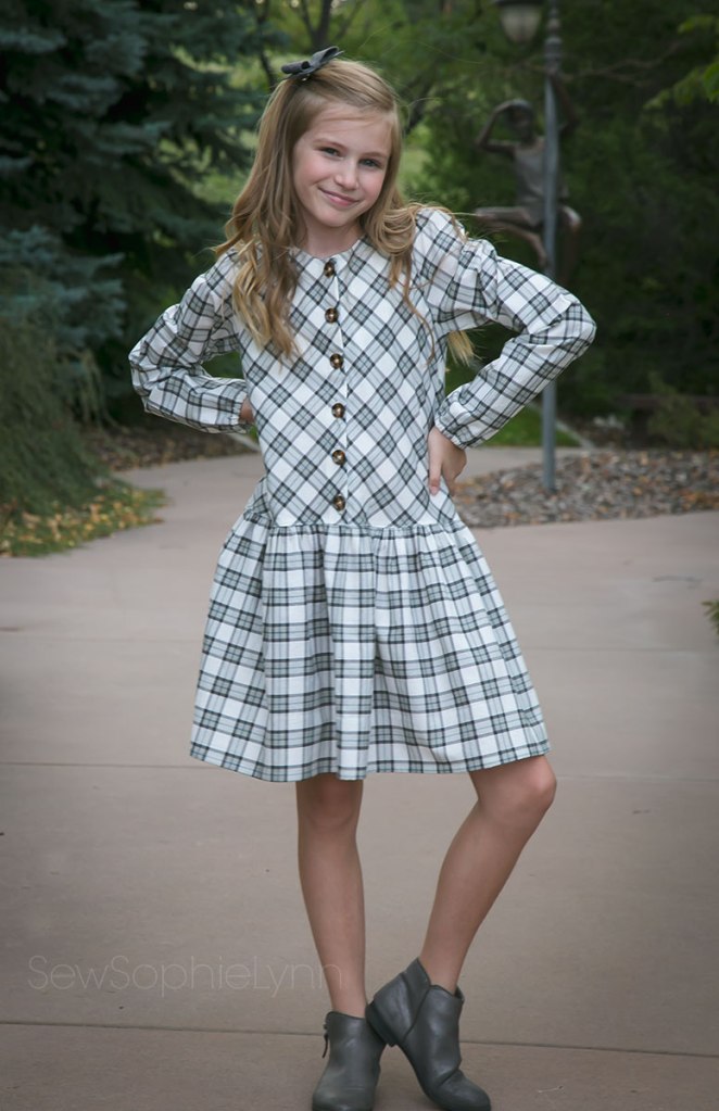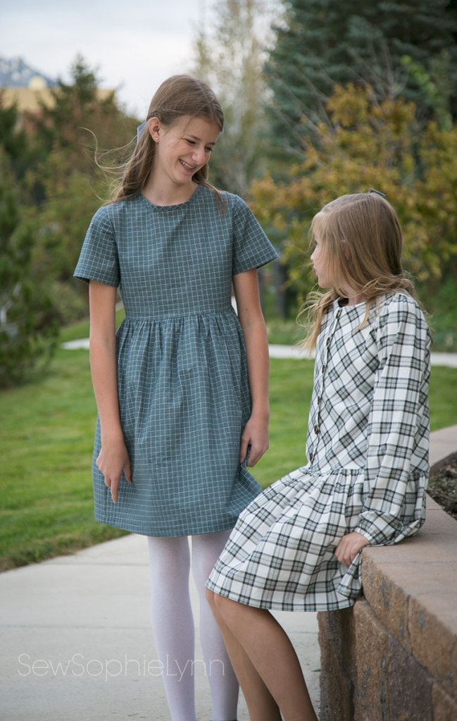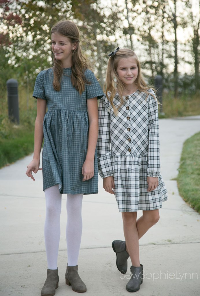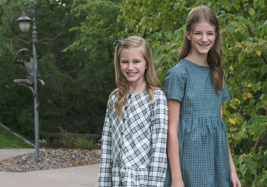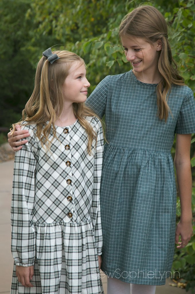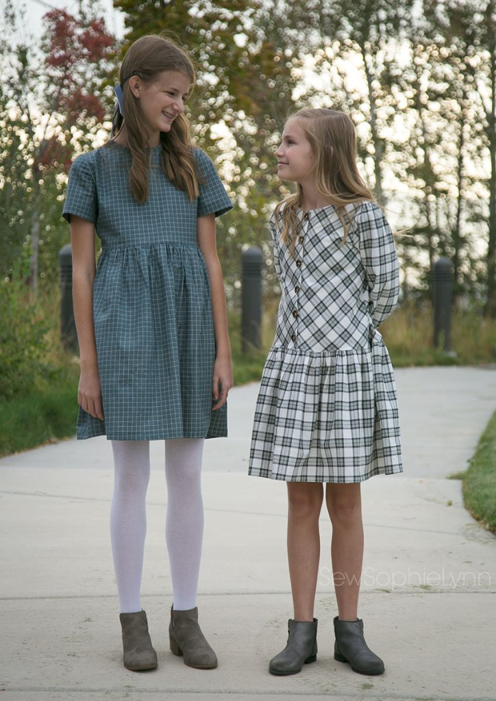 I was excited to sew new dresses for my girls. We scoured our patterns and I had to purchase the new Little Lizard King Nara after discovering I was seriously lacking a cute drop waist dress pattern. Now, that cream plaid dress was meant for my oldest daughter but when she tried it on it was shockingly short and not at all drop waist! Oh boy! Turns out I totally forgot to lengthen it for her tall body, duh! Sewing fail for sure. I’d printed out the pattern weeks ago in preparation and then just went for it when it came time to finally sew it up. Luckily, little sis LOVED it and was thrilled with my ‘mistake’. And the cute teal dress looks darling on big sis- win win!