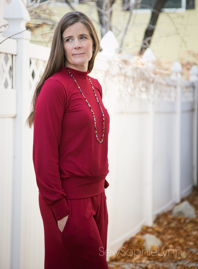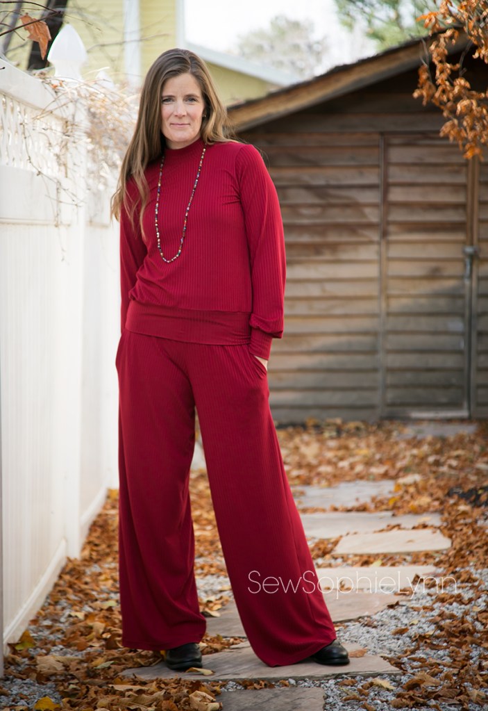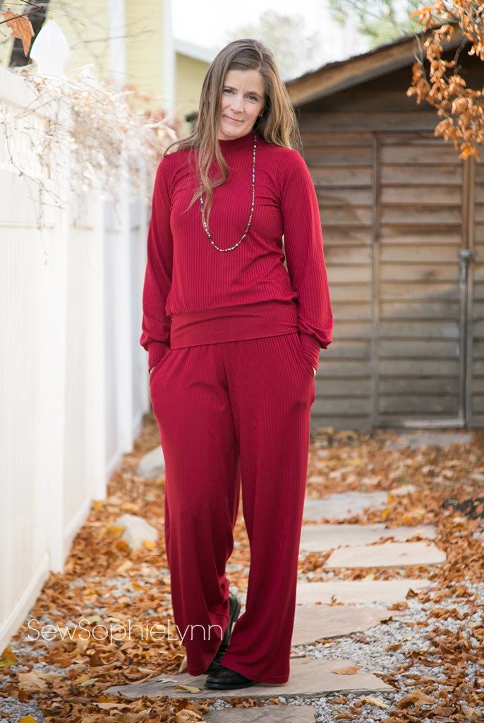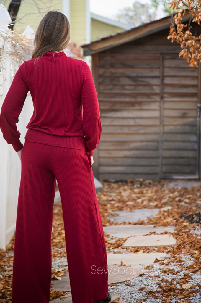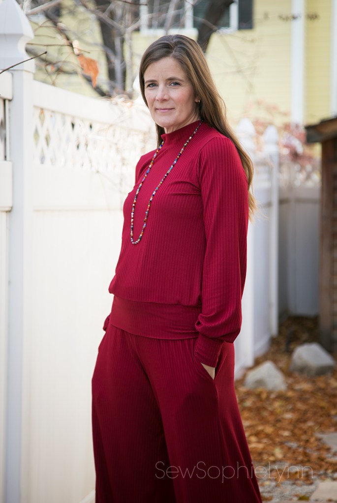 I used this super soft Burgundy Rib Knit for an outfit that is the ultimate in comfort! I sewed yet another Love Notion Arlington (pretty sure I have one for everyday of the week now!). For this version I sewed a size small, bishop sleeve, mock neck, banded top. For the bottoms, I dug deep into my pattern stash. These are the Jocole Wide Legs. This was one of the first PDF patterns I ever sewed and it was fun to pull it out again. I knew I wanted a wide leg bottom with pockets and this pattern fit the bill. I sewed up a medium with an xxxl rise. It’s made to be more low rise and I wanted a nice rise that hit around my natural waist. The waist is finished with a yoga waistband for the perfect pant to wear when you’re filling your belly with delicious holiday goodies!