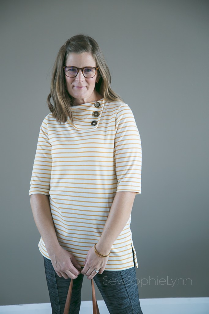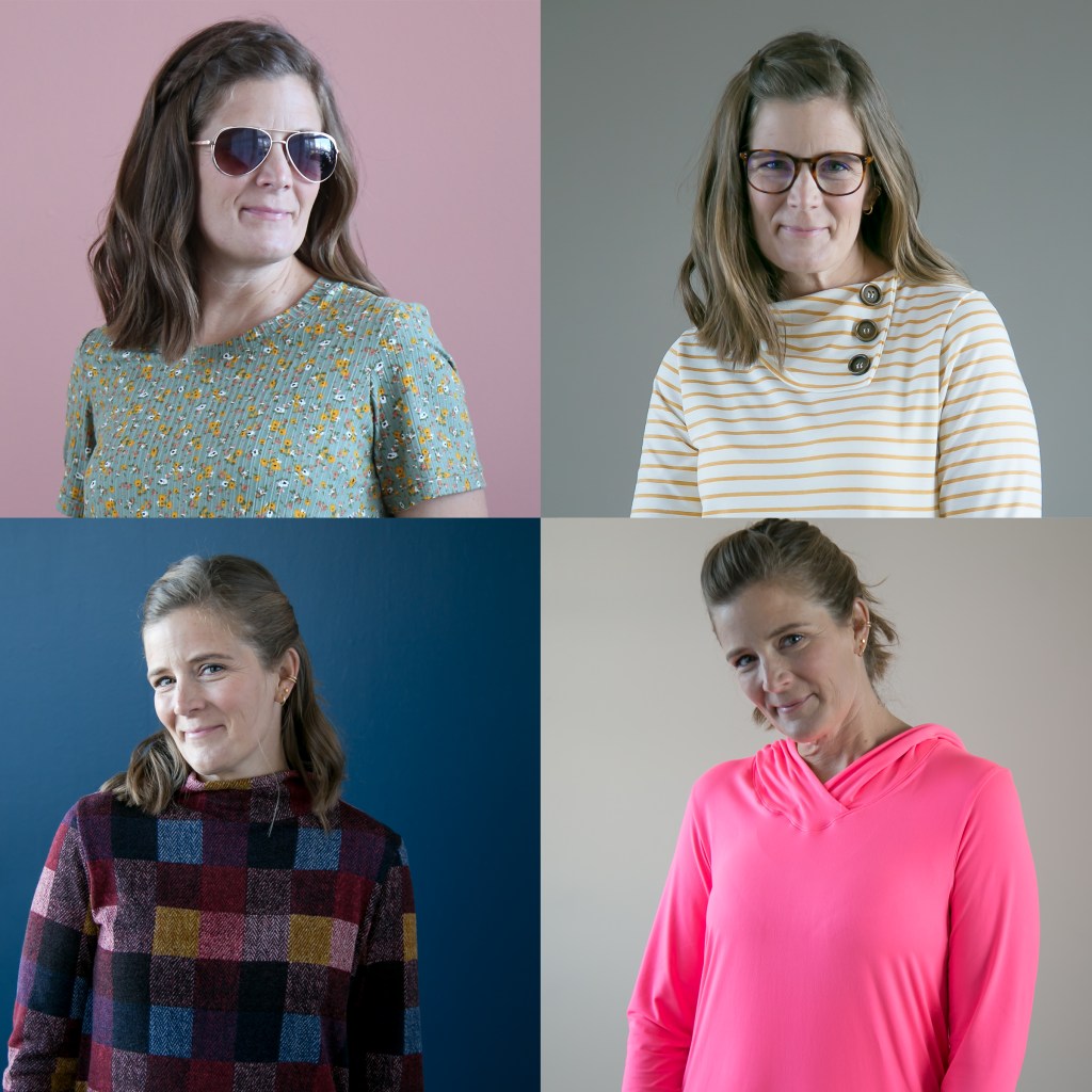 I sewed up a Terra for every season and can’t believe how versatile this pattern is! There are six different necklines: scoop, v-neck, v-neck hood, funnel, boat, and asymetrical collar. There are also four different sleeve lengths: long, 3/4, elbow, and short. With all those options, it was hard to pick which version to sew. So I did what any good sewist would do- I sewed up 4! One for each season!