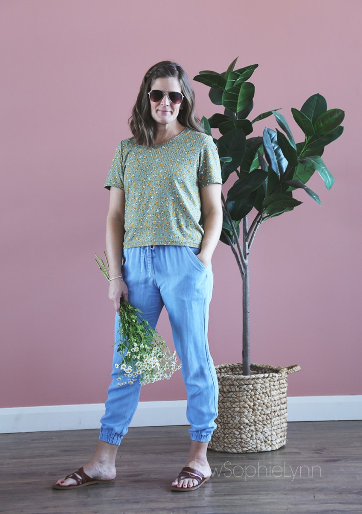 I’ve paired it with my all-time favorite Love Notions pattern- the Allegro Bottoms. It’s the all-star pattern in my collection and it always comes in clutch. You’ll see a few different pairs in this post and I love how versatile it is. This pair in lightweight Tencel denim has been a staple for me. I can wear them year round and dress them up or down.