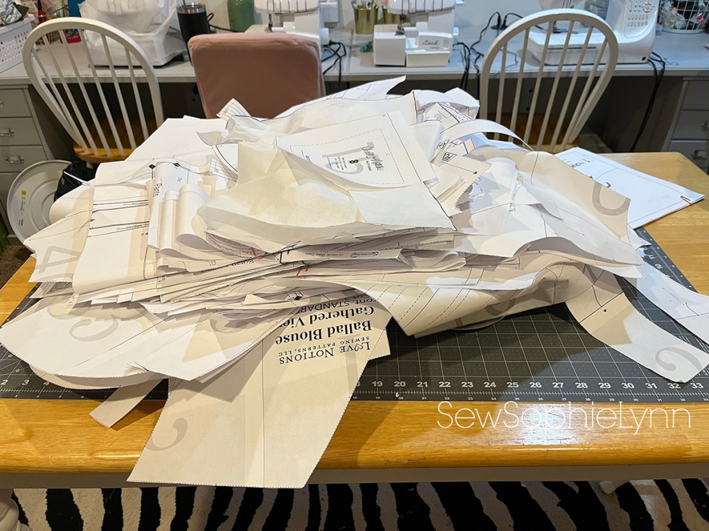 Since I sew for my kids so much a projector just makes so much sense! This is my pile of printed patterns from the last year or so that I hadn’t filed away. Going through them about 75% were for my kids which means you guessed it, they had already outgrown them! I can’t wait to not have to print and cut out multiple sizes as my kids grow and grow or when I’m sewing up the same pattern for multiple kids. I’ve cut way down on pattern testing but in future tests a projector file would save a ton of time and paper. Paper- that’s a whole other issue. For patterns that I use again and again, I never felt bad about printing a pattern. But for those patterns that you might only use once or twice the waste is a little disheartening. Not anymore!