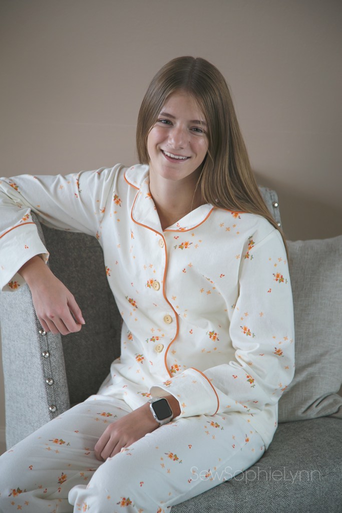 I sewed up a size 10, no adjustments. The pants are your basic pajama pants and sew up quickly. The addition of the pockets make these perfect for lounging too (gotta keep that cell phone handy). The top kind of intimidated me with the button front, notched collar and all of that piping. I was surprised by how simple it was to construct though and the finishing is *chef’s kiss!