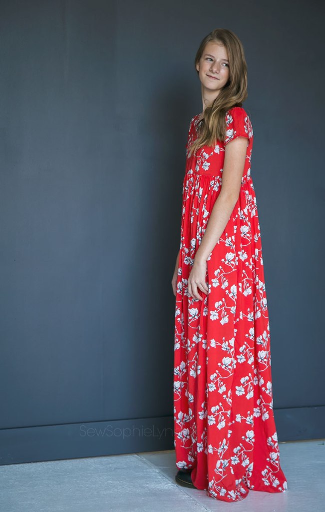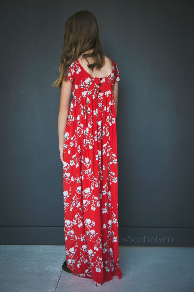 Sophie’s been growing like crazy and her maxi dresses are suddenly no longer maxi length. For her look we knew we wanted a comfortable but dramatic piece. She picked Magnolia Study Silkroad a vibrant red print that is the perfect floral for this anti-floral girly. It’s refined and subtle and just right for this picky girl.