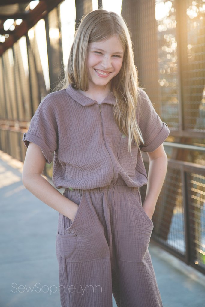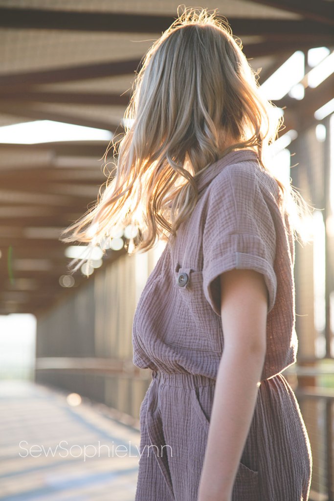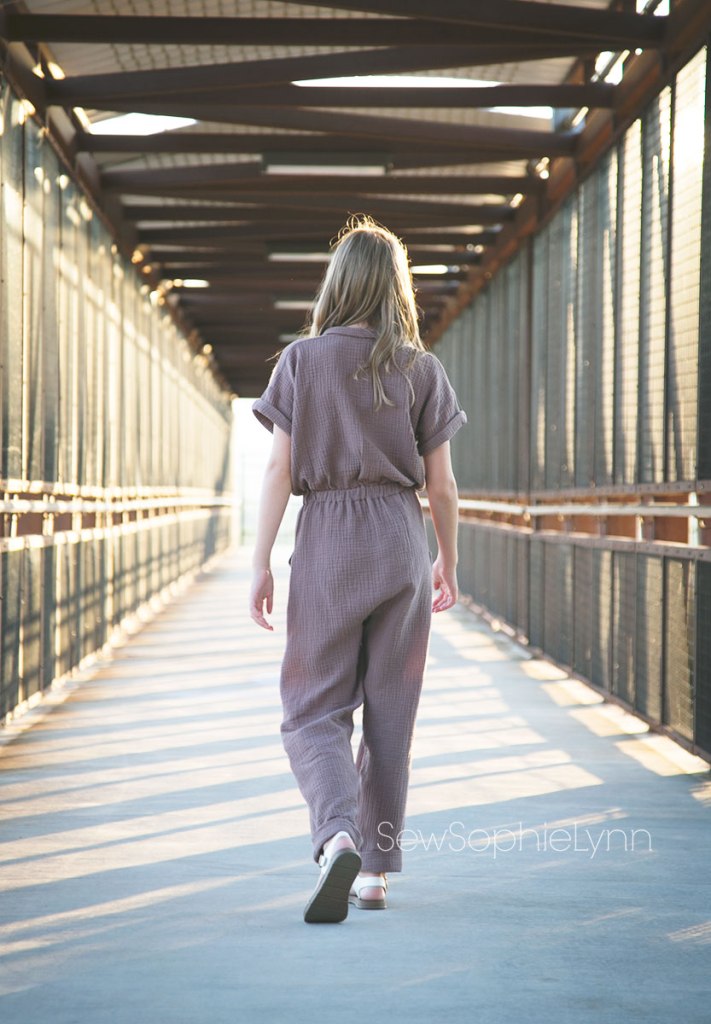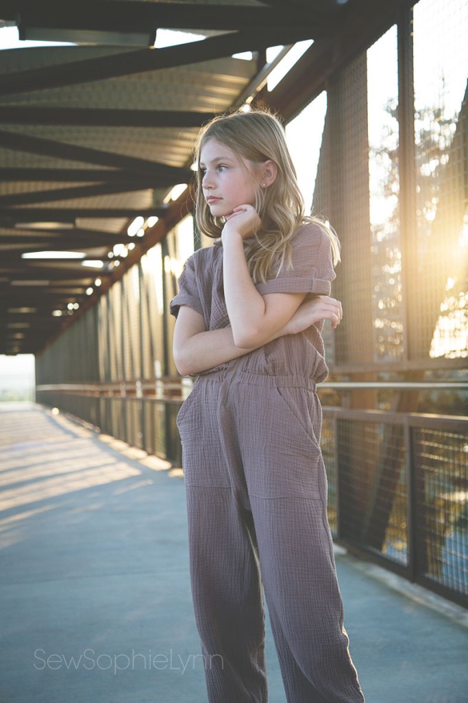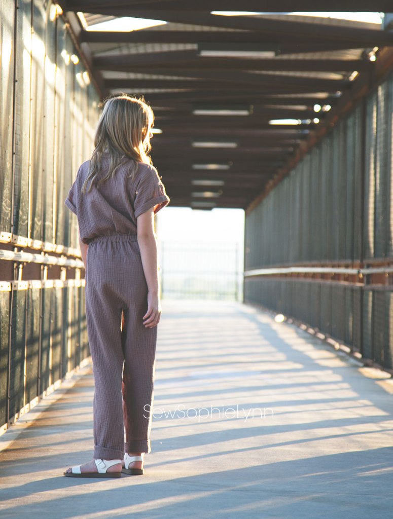 I headed into Raspberry Creek Fabrics to pick fabric and have to admit I was a little stumped. In the wrong fabric, she could end up looking more industrial and way less modern and trendy. I settled on this dreamy milk chocolate brown double gauze that is both soft and easy to work with. This fabric is a new favorite of mine and I’m trying my best to fill all of our closets with it! It’s so squishy and cozy and I can imagine wearing it head to toe in a jumpsuit would be the best thing EVER.