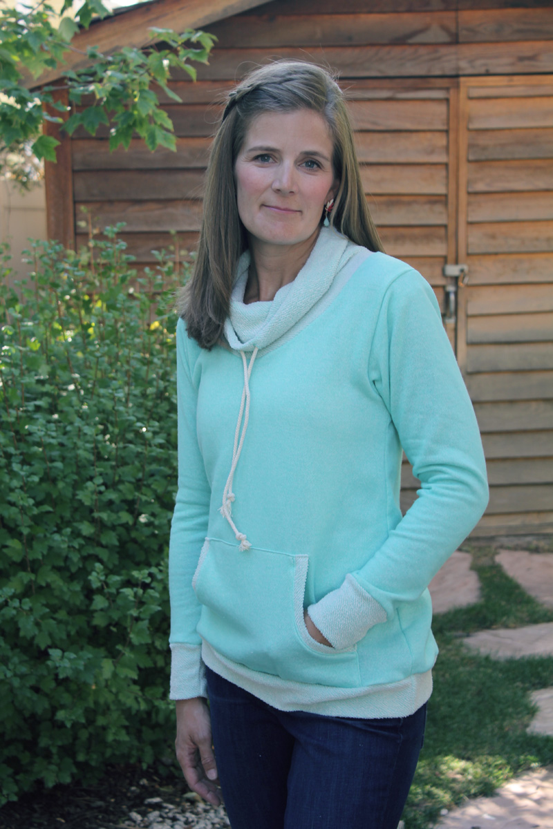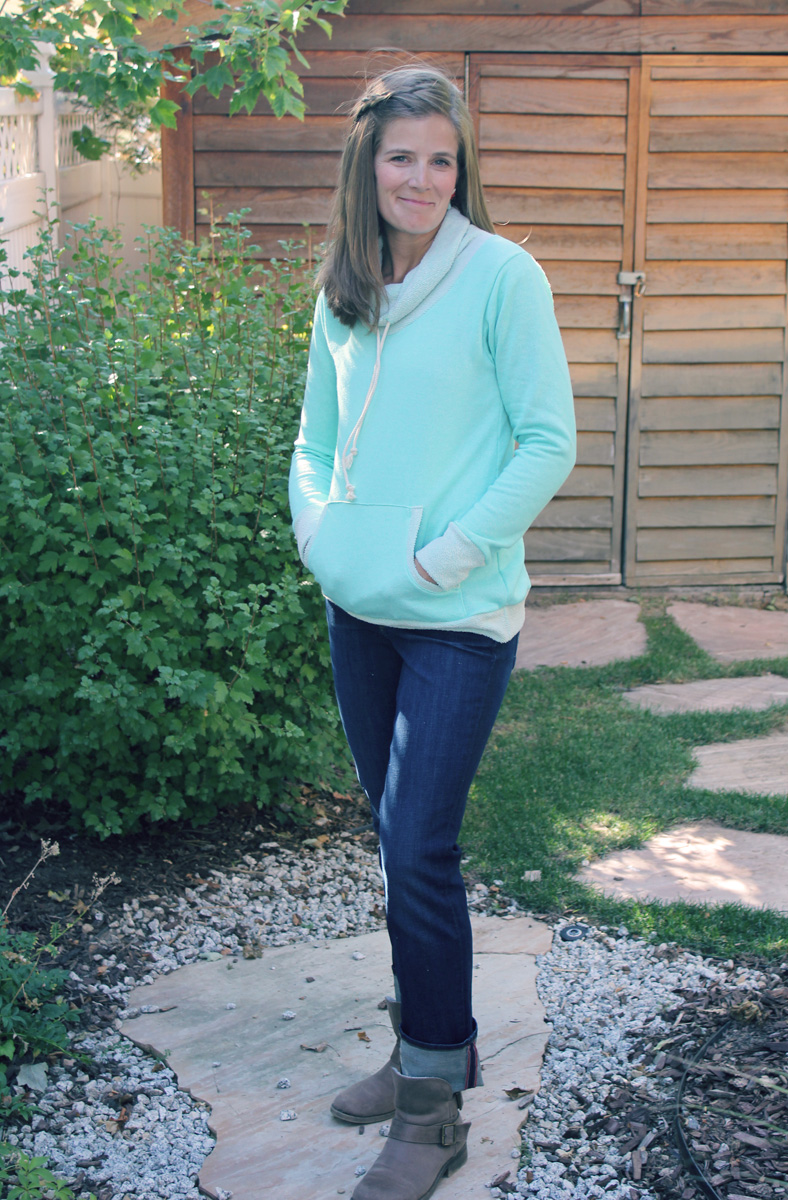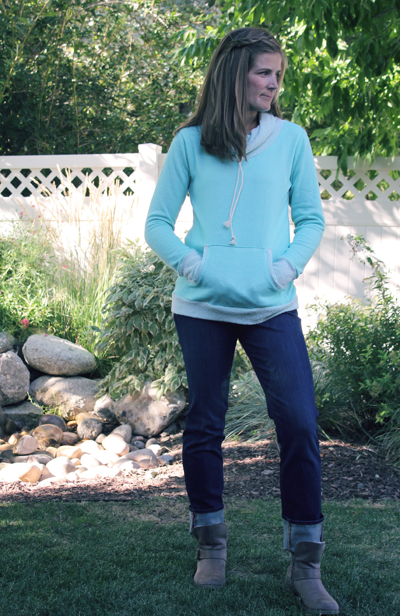 I raised the neckline up a bit and added the cowl. I love the cowl a little snugglier around my neck. Such a cozy sweatshirt! I used an incredible organic bamboo french terry from CaliFabrics for this version and it’s a little piece of heaven. This slate blue color is so pretty and works well in my wardrobe.