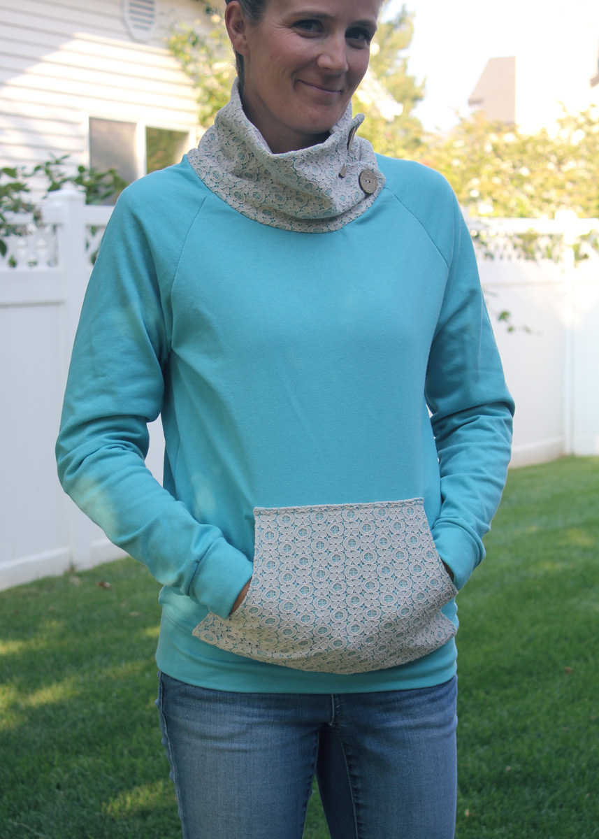 Now enter Patterns for Pirates Raglan Bundle Pack. Holy cow, do I love this pattern! That button-up cowl with those big ‘ol wood buttons is pretty fantastic. The options with this pattern are endless. This is a non-stretch sweatshirt fleece in a size small. It’s a little snug and I think I’d go up a size next time I use fabric this stiff.